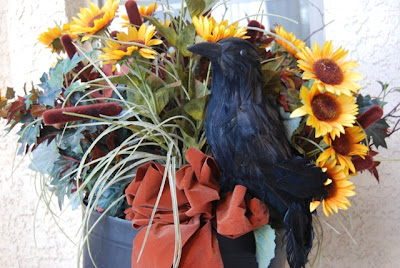 This is a big floral arrangement I made in a large black plastic cauldron. We have a thing about sunflowers and ravens at our house.